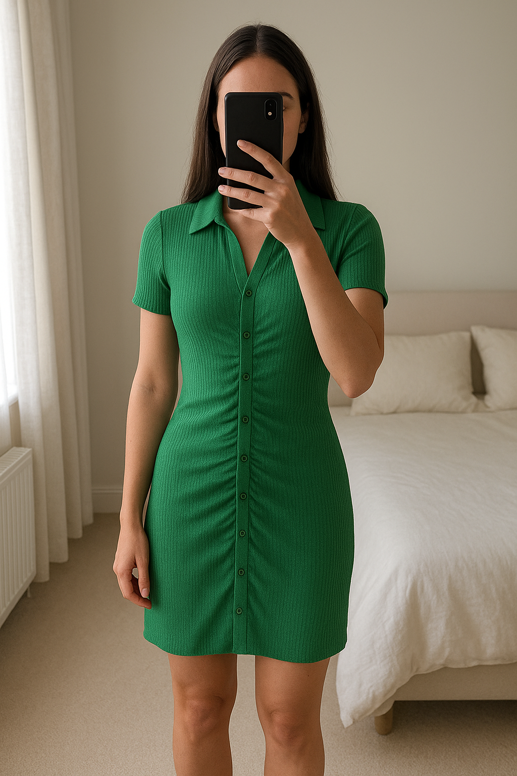 Green plt dress standing straight facing the camera, in a softly lit bedroom setting, with gentle natural light filtering through a window.