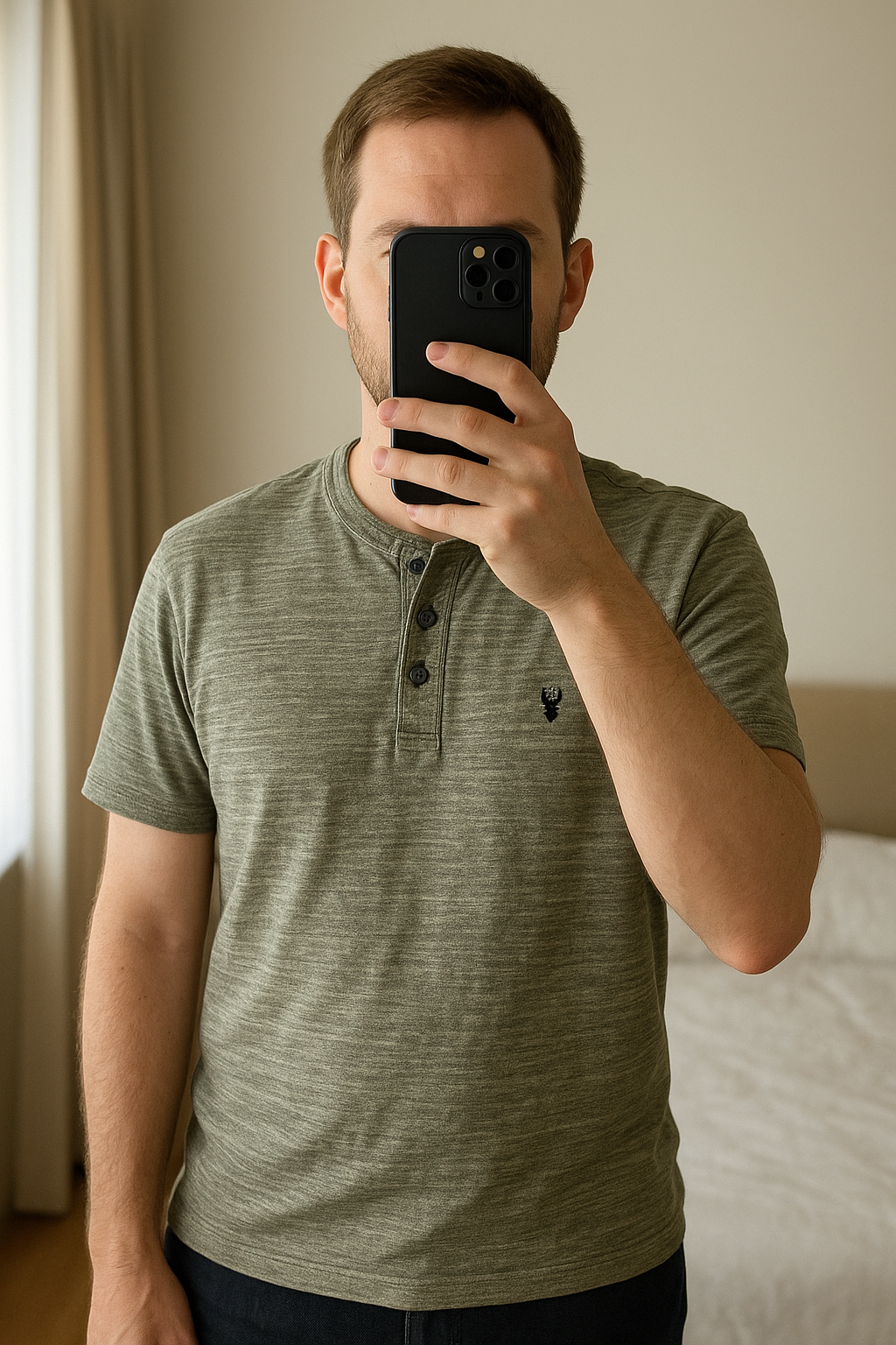 Green stripped T-shirt standing straight facing the camera, in a softly lit bedroom setting, with gentle natural light filtering through a window.