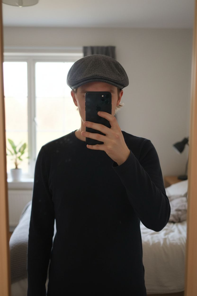 Grey Flat Cap Baker Boy Hat Classic Vintage Peaky Blinders Style Adjustable size standing straight facing the camera, in a softly lit bedroom setting, with gentle natural light filtering through a window.
