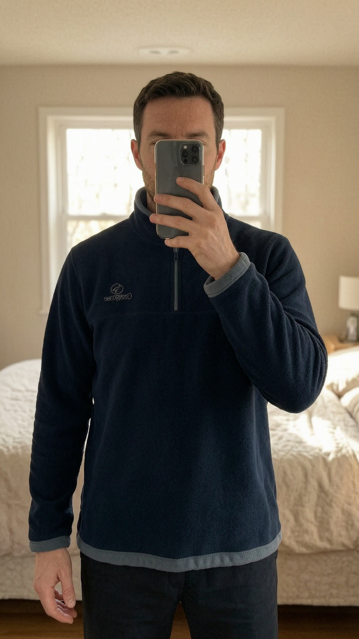 Grey Goose Navy Quarter Zip Fleece XL standing straight facing the camera, in a softly lit bedroom setting, with gentle natural light filtering through a window.