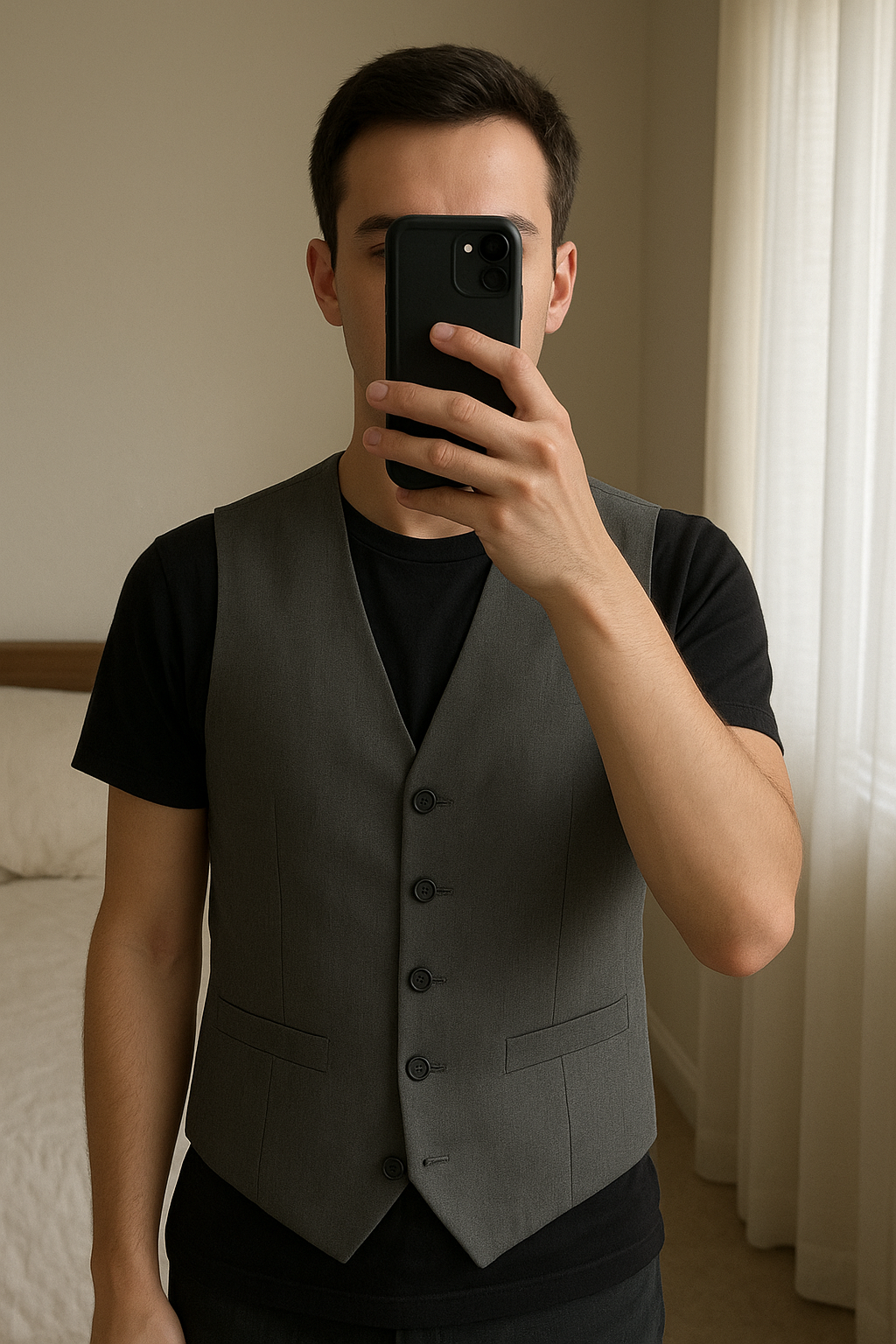 Grey waistcoat standing straight facing the camera, in a softly lit bedroom setting, with gentle natural light filtering through a window.