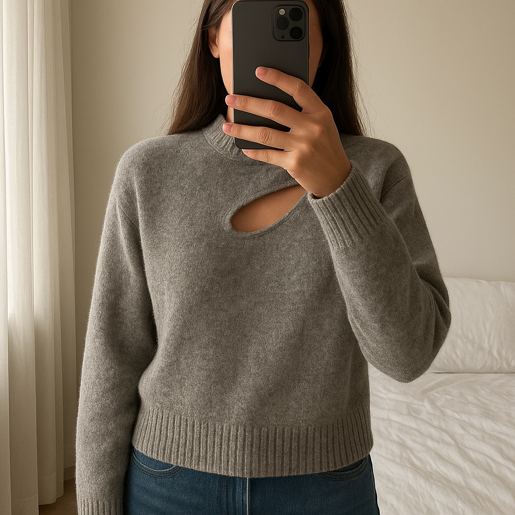 Grijze trui van Costs standing straight facing the camera, in a softly lit bedroom setting, with gentle natural light filtering through a window.