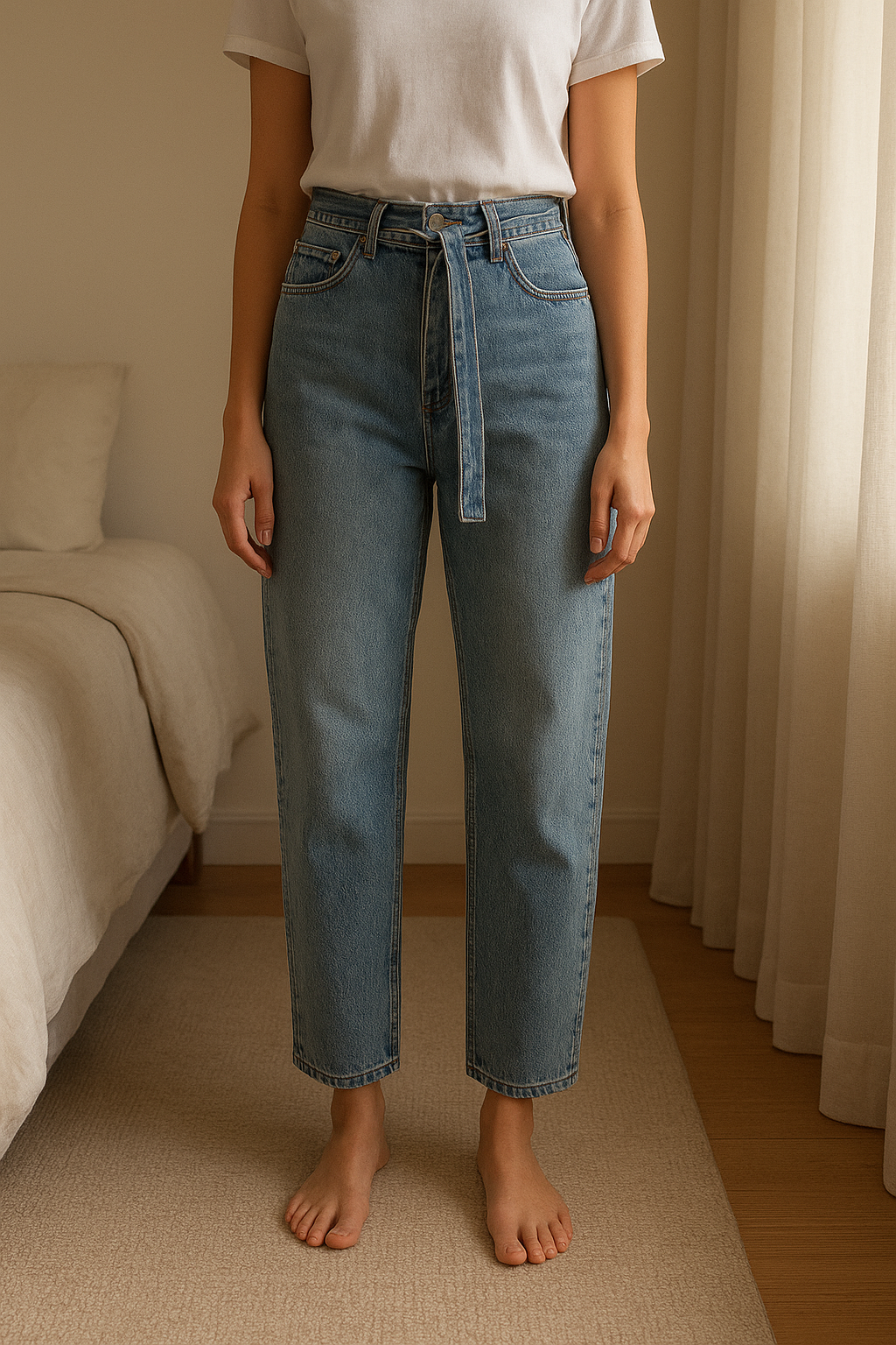 Guess mom jeans with tie - size 10 standing straight facing the camera, in a softly lit bedroom setting, with gentle natural light filtering through a window.