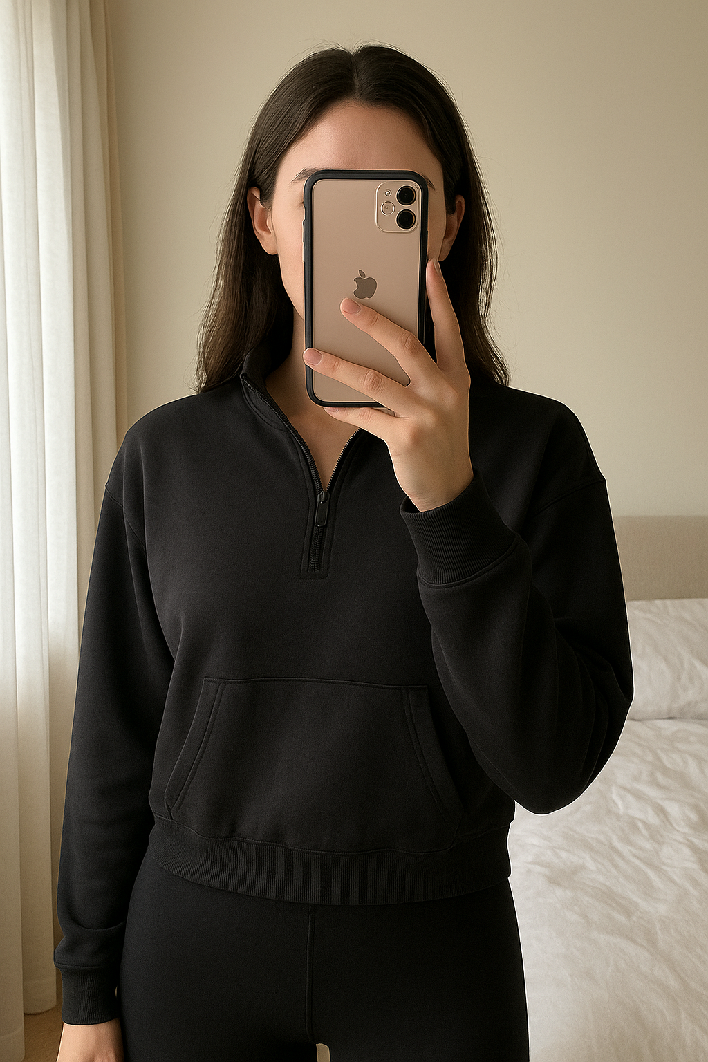 Gymshark top standing straight facing the camera, in a softly lit bedroom setting, with gentle natural light filtering through a window.