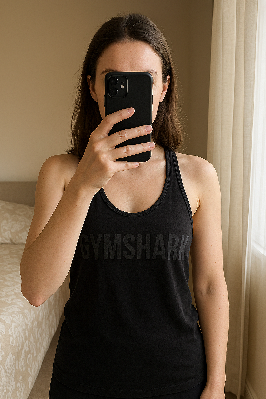 Gymshark Vest standing straight facing the camera, in a softly lit bedroom setting, with gentle natural light filtering through a window.
