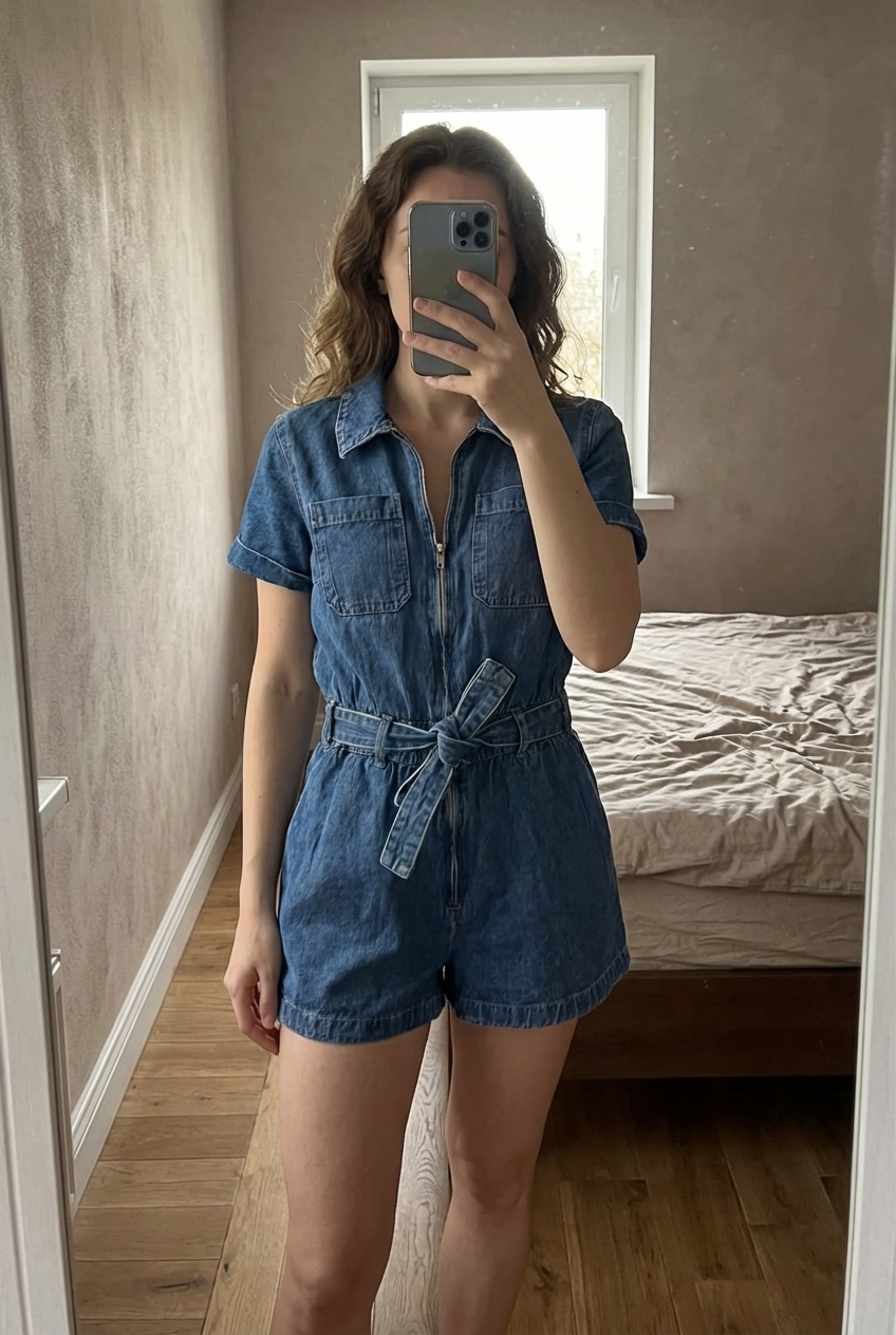H&M Blue Denim Belted Playsuit Zip Front Short Sleeve UK 6 standing straight facing the camera, in a softly lit bedroom setting, with gentle natural light filtering through a window.