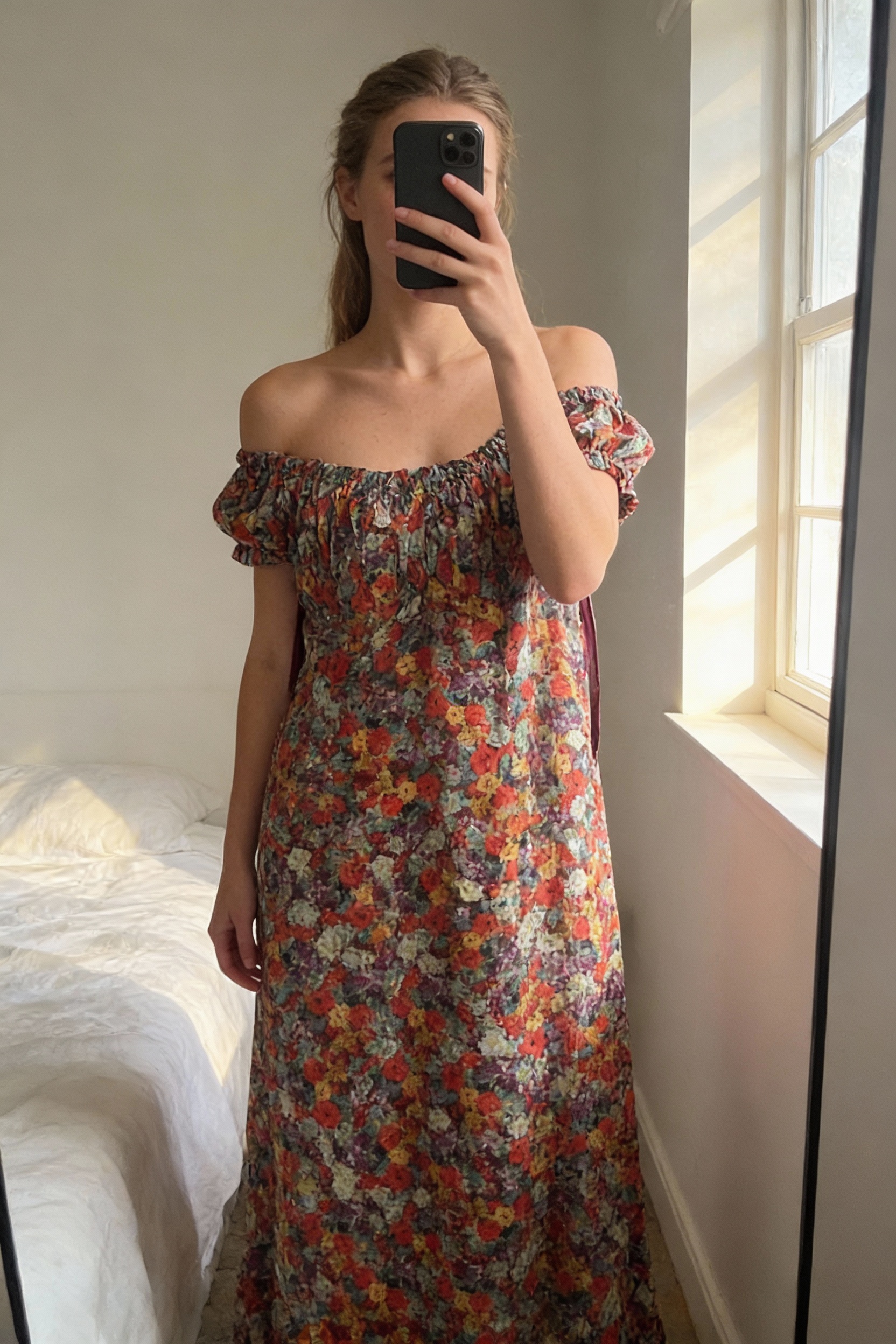 H&M Floral Dress standing straight facing the camera, in a softly lit bedroom setting, with gentle natural light filtering through a window.
