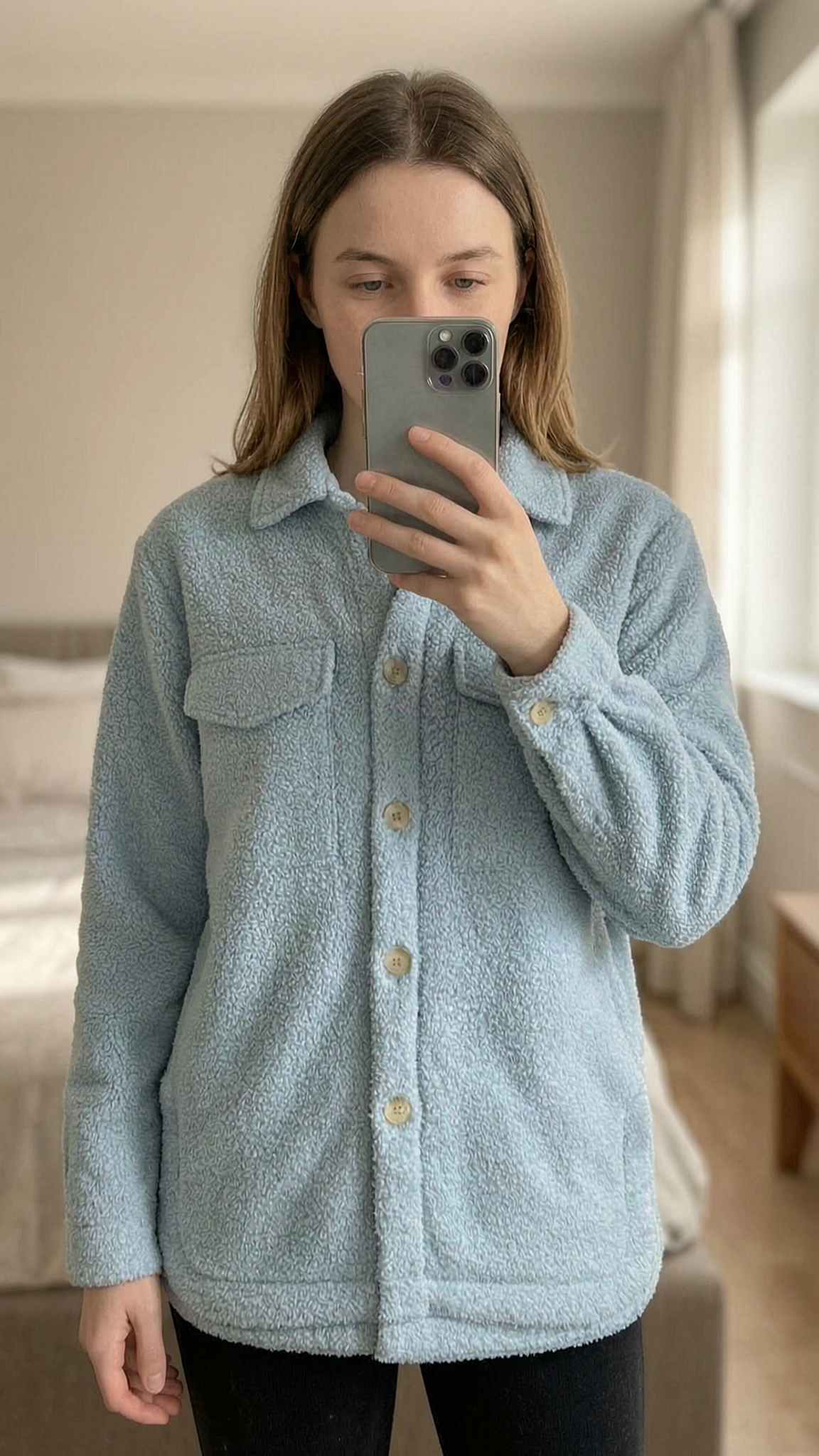 H&M Light Blue Teddy Fleece Shirt Jacket / Overshirt Size XS New Without Tags Perfect Spring Layer standing straight facing the camera, in a softly lit bedroom setting, with gentle natural light filtering through a window.