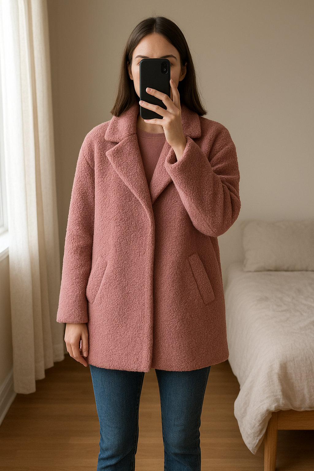 H&M Pink Borg Coat - Size L standing straight facing the camera, in a softly lit bedroom setting, with gentle natural light filtering through a window.