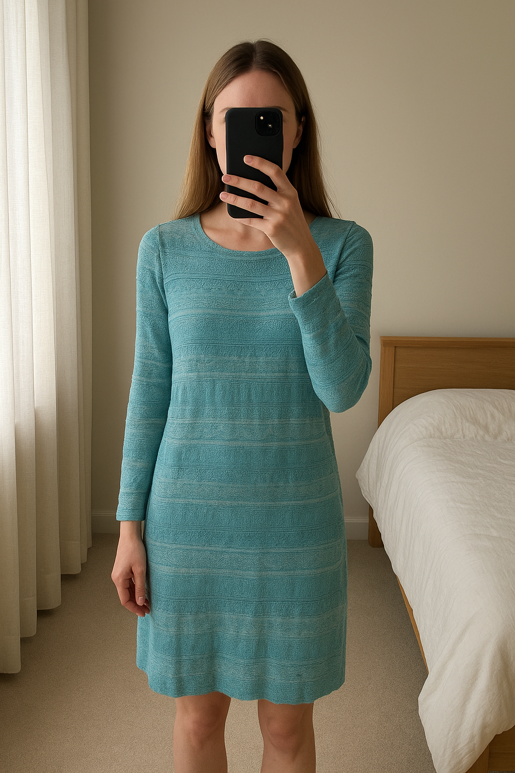H&M,size s, lace dress standing straight facing the camera, in a softly lit bedroom setting, with gentle natural light filtering through a window.