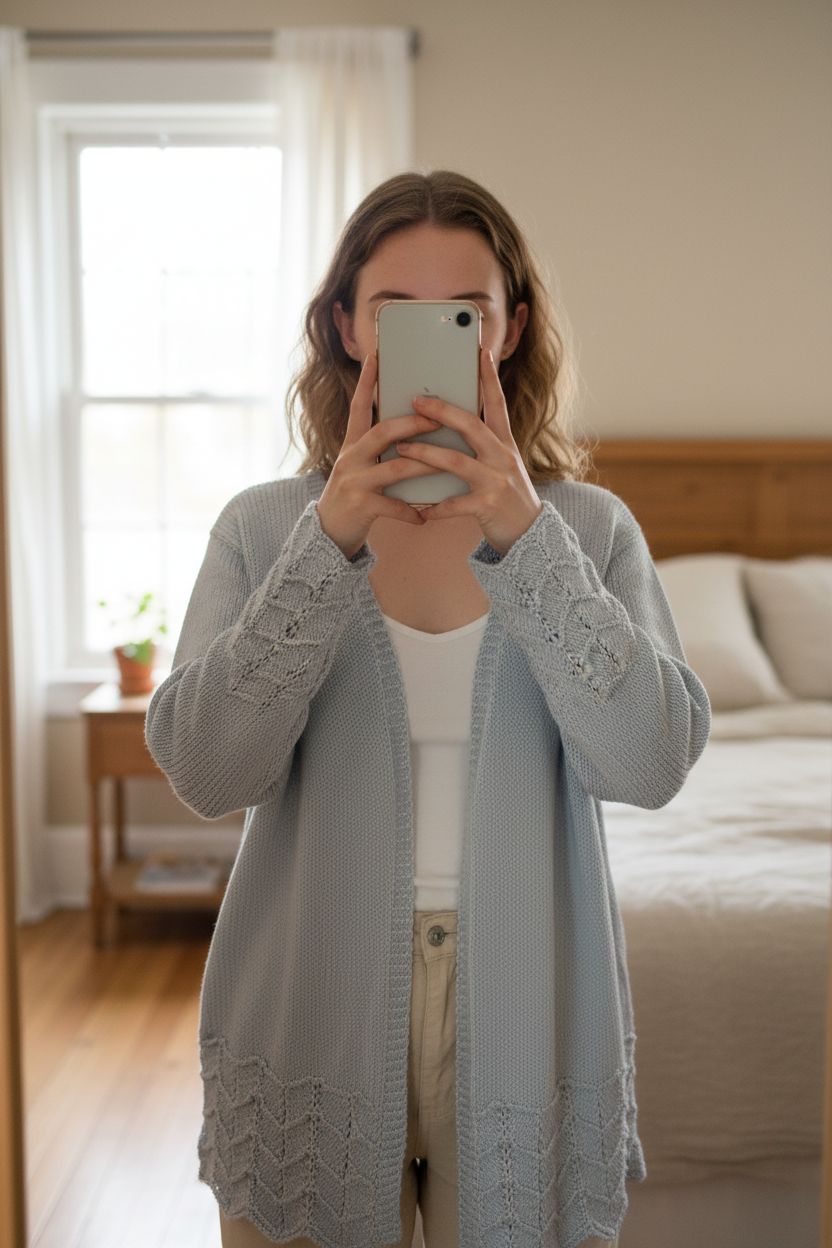Hand-Knitted Cardigan M Cashmere Merino Debbie Bliss Yarn Pale Grey Blue cottagecore slow fashion standing straight facing the camera, in a softly lit bedroom setting, with gentle natural light filtering through a window.