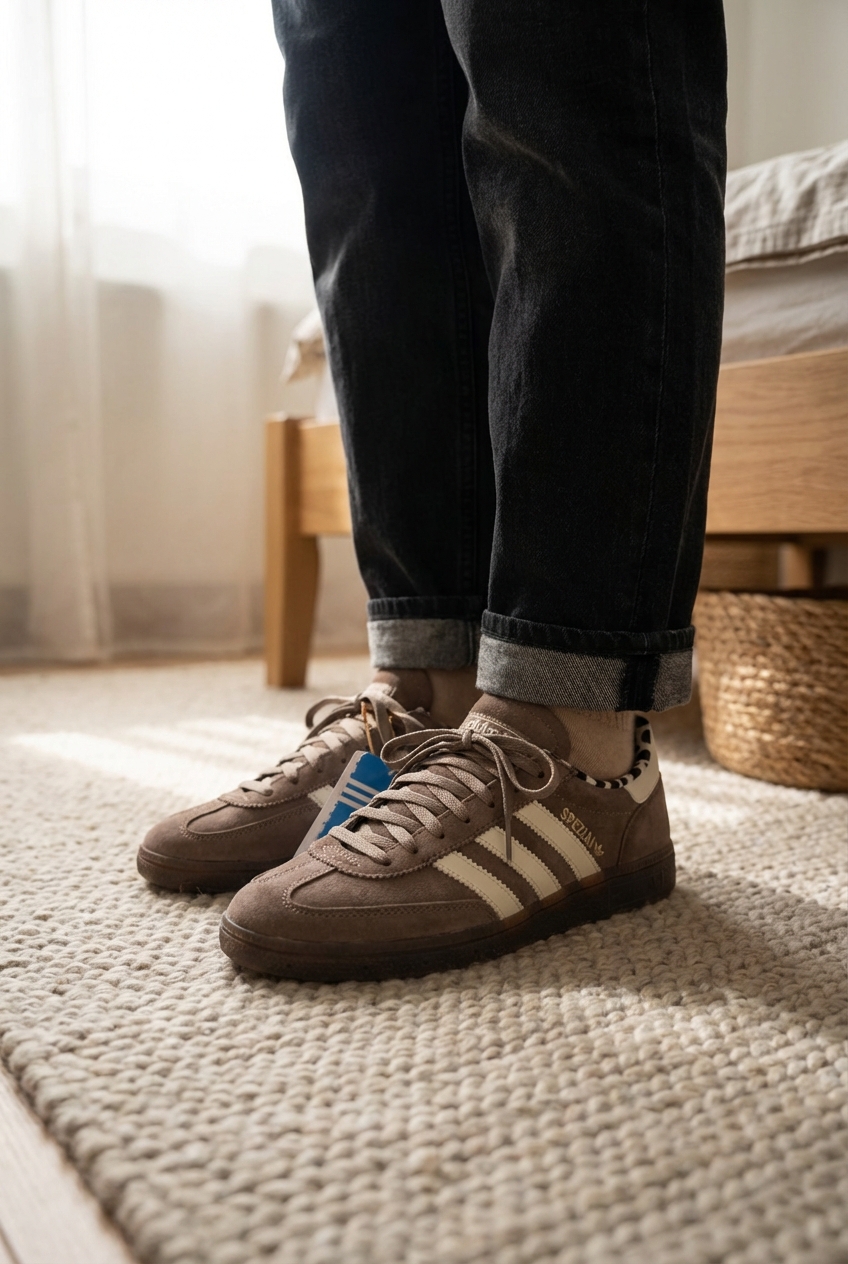 Handball speazial adidas debout, face à la caméra, dans une chambre à la lumière douce, avec une lumière naturelle filtrant par la fenêtre.