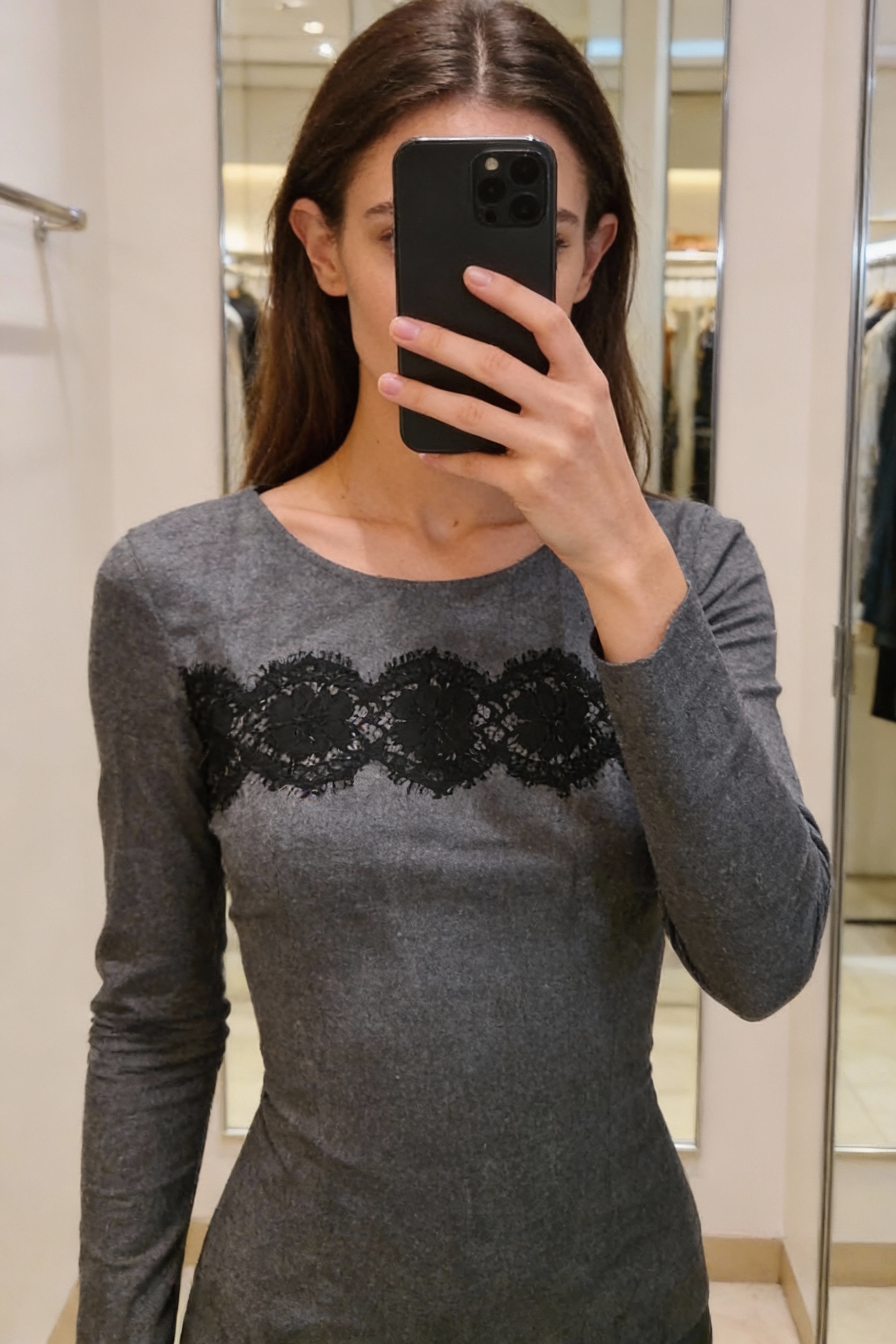 Une personne en Haut femme Gérard darel debout, face à la caméra, avec une silhouette fine, dans une cabine d’essayage de style boutique avec un miroir et une décoration neutre.