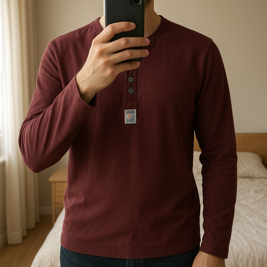Haut homme manches longues CBK – Coast Travel – 100 % coton debout, face à la caméra, dans une chambre à la lumière douce, avec une lumière naturelle filtrant par la fenêtre.