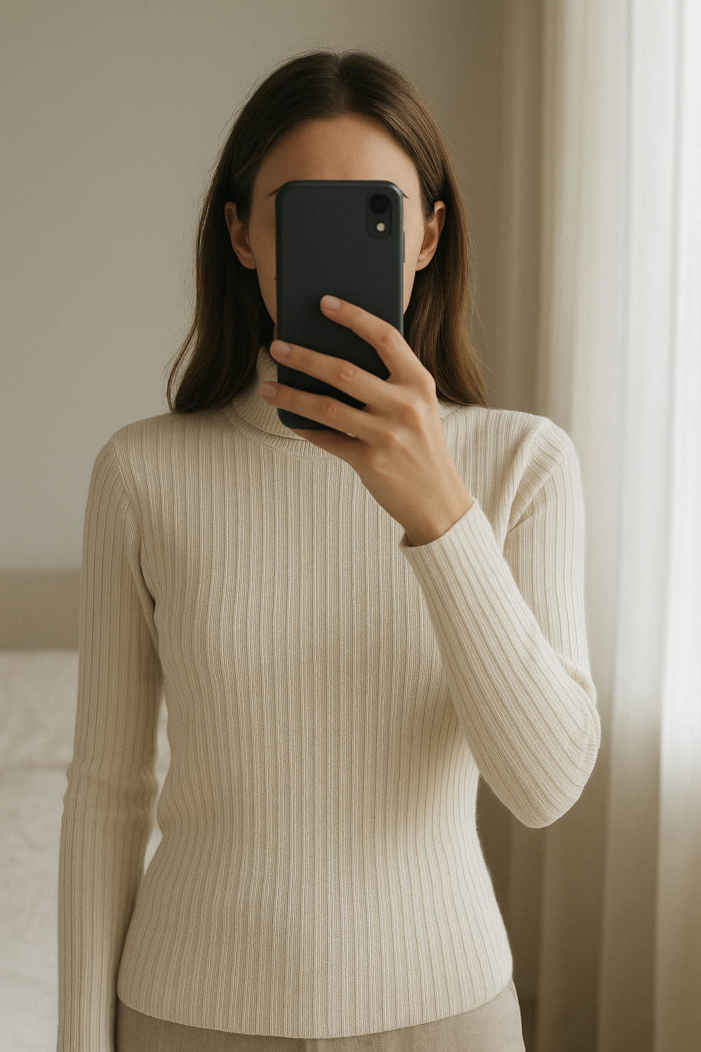 Haut primark aufrecht stehend, der Kamera zugewandt, in einem sanft beleuchteten Schlafzimmer, mit natürlichem Licht, das durch ein Fenster fällt.