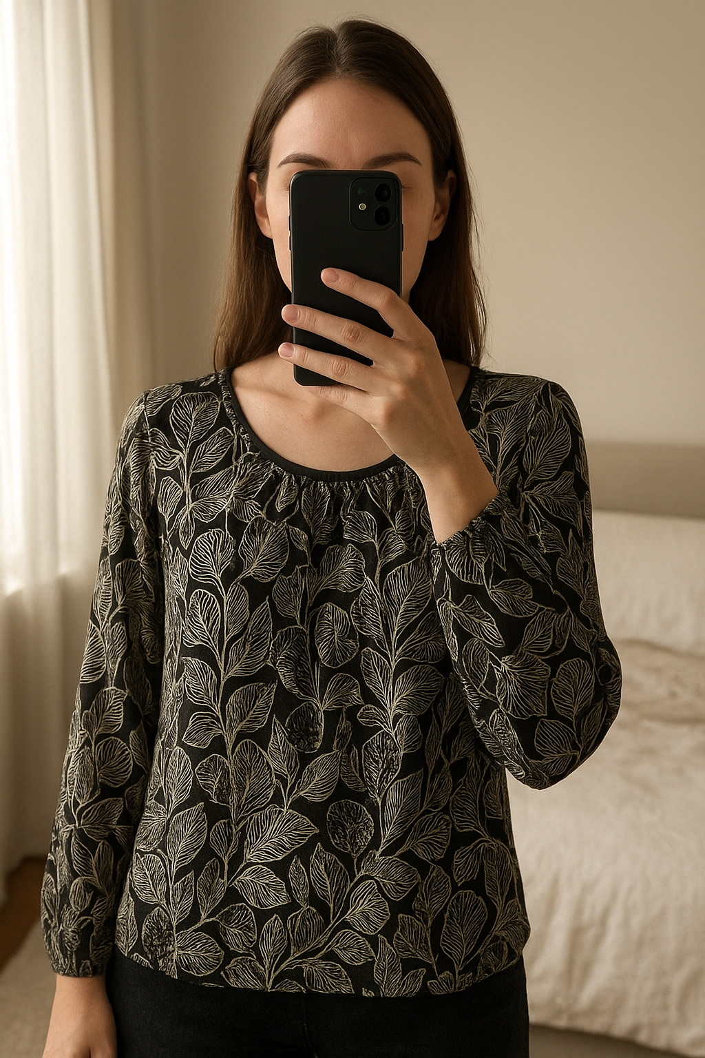 Haut taille xl debout, face à la caméra, dans une chambre à la lumière douce, avec une lumière naturelle filtrant par la fenêtre.