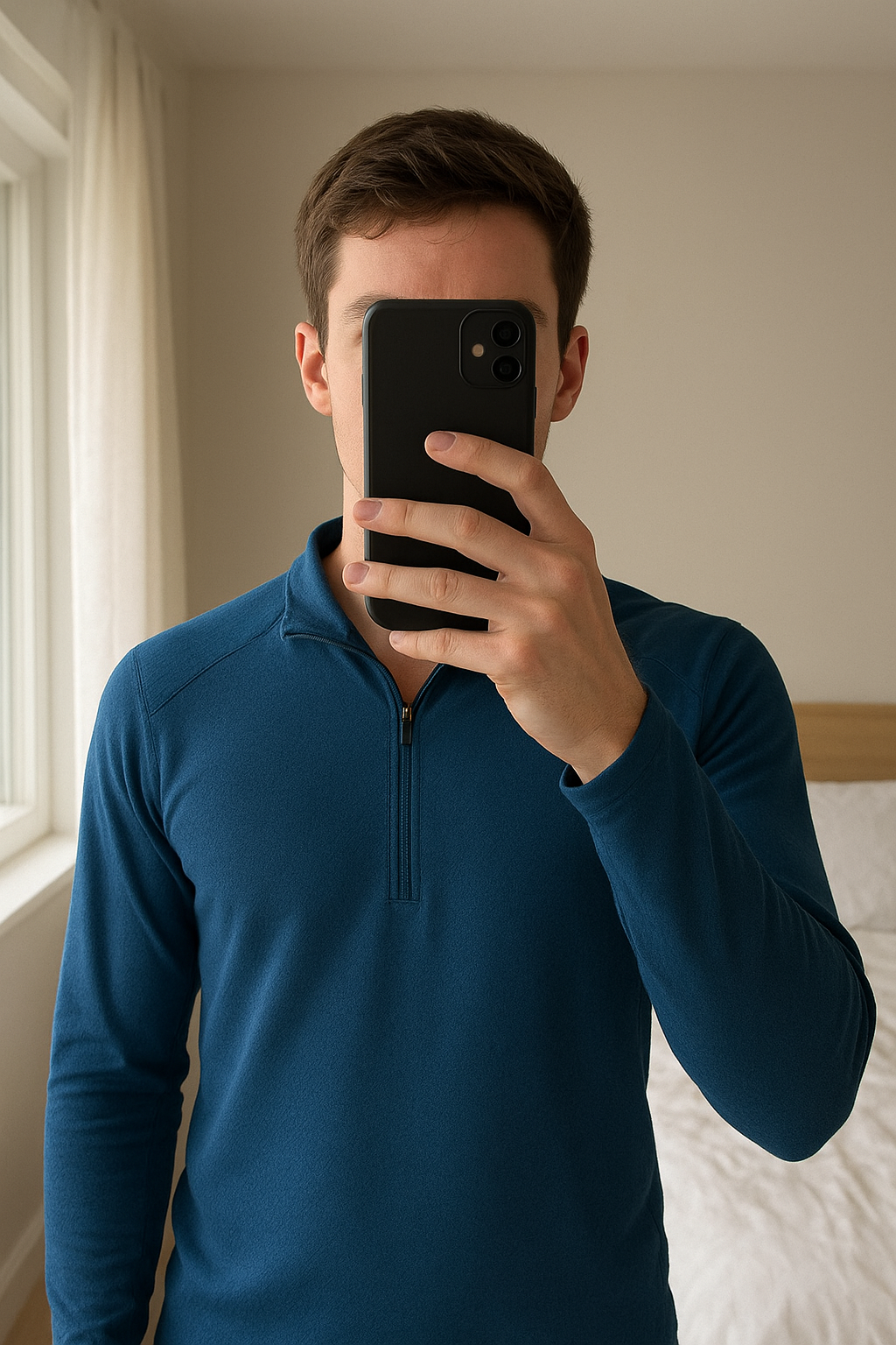 Higher state running top standing straight facing the camera, in a softly lit bedroom setting, with gentle natural light filtering through a window.