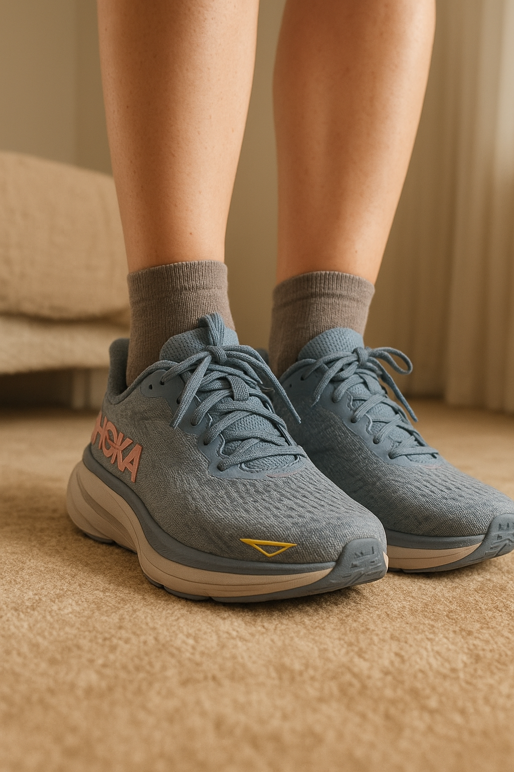 Hoka Clifton 9 debout, face à la caméra, dans une chambre à la lumière douce, avec une lumière naturelle filtrant par la fenêtre.