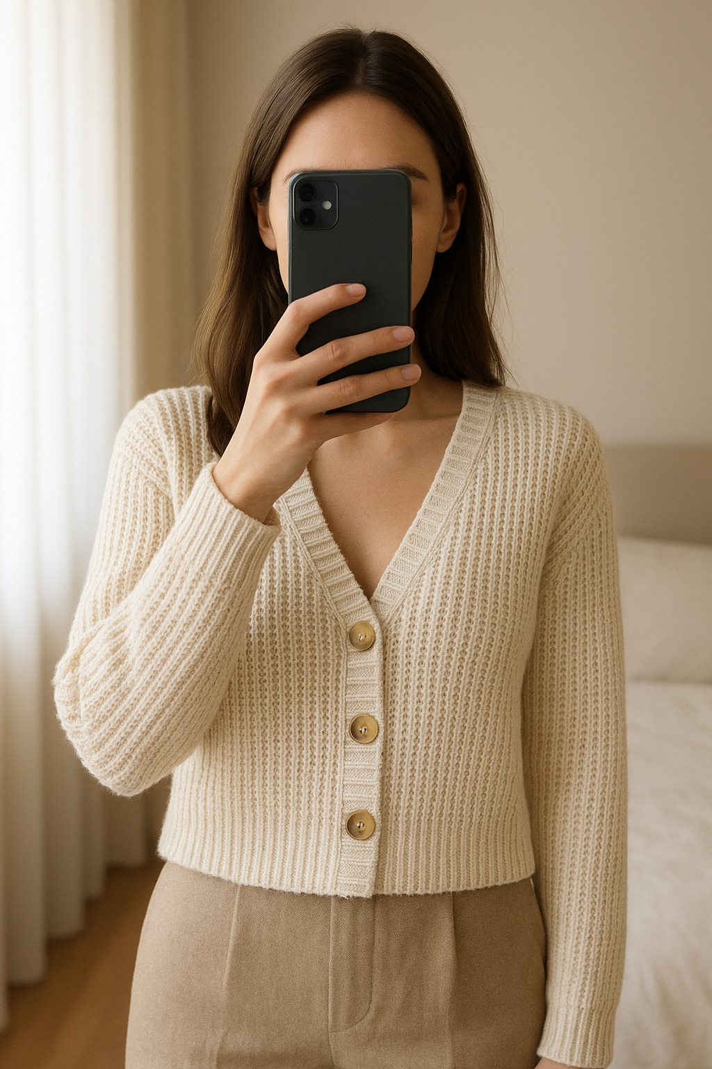 Hollister White Cardigan with Tortoise Shell Buttons Medium M standing straight facing the camera, in a softly lit bedroom setting, with gentle natural light filtering through a window.