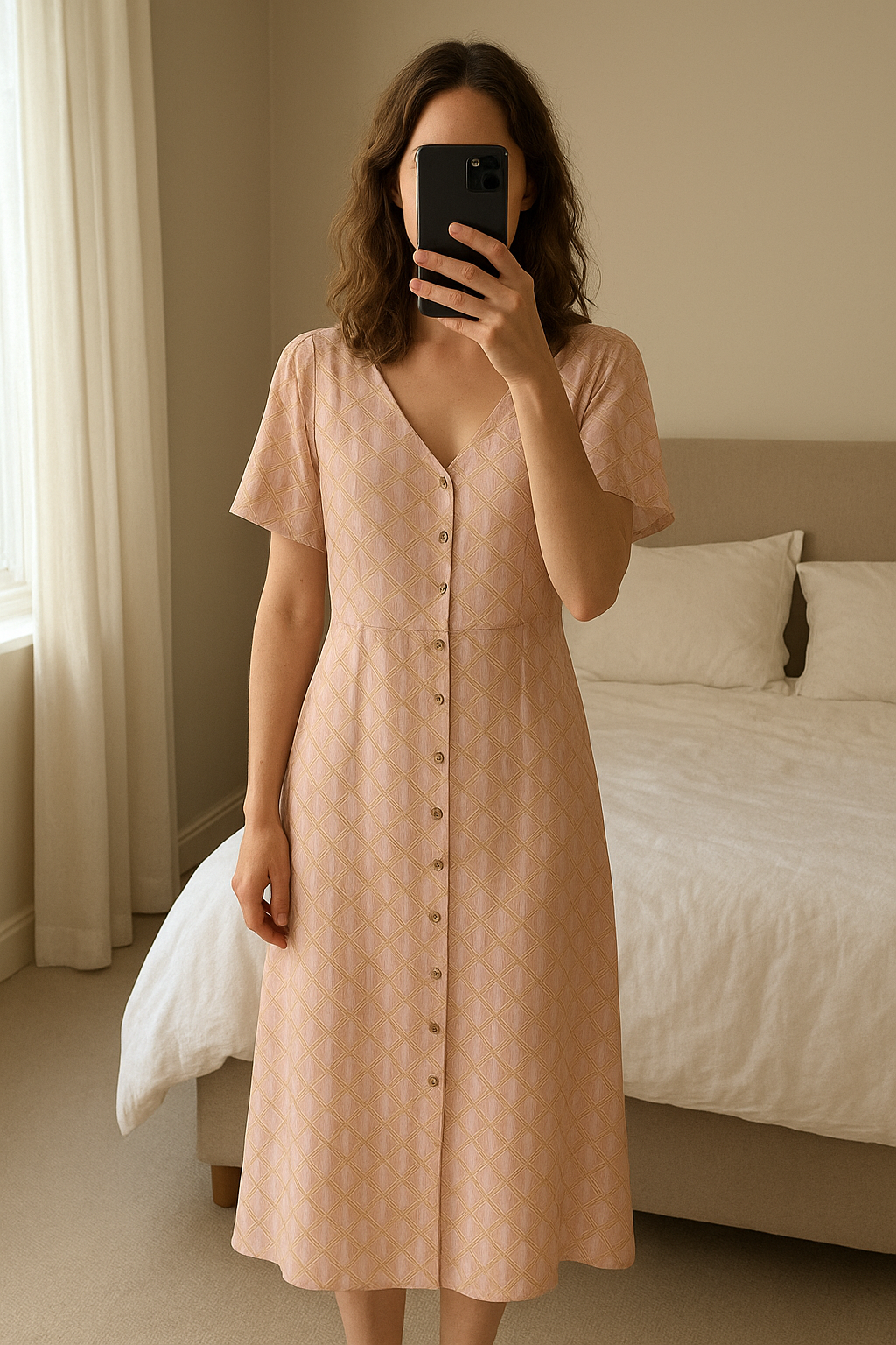 Hush midi dress standing straight facing the camera, in a softly lit bedroom setting, with gentle natural light filtering through a window.