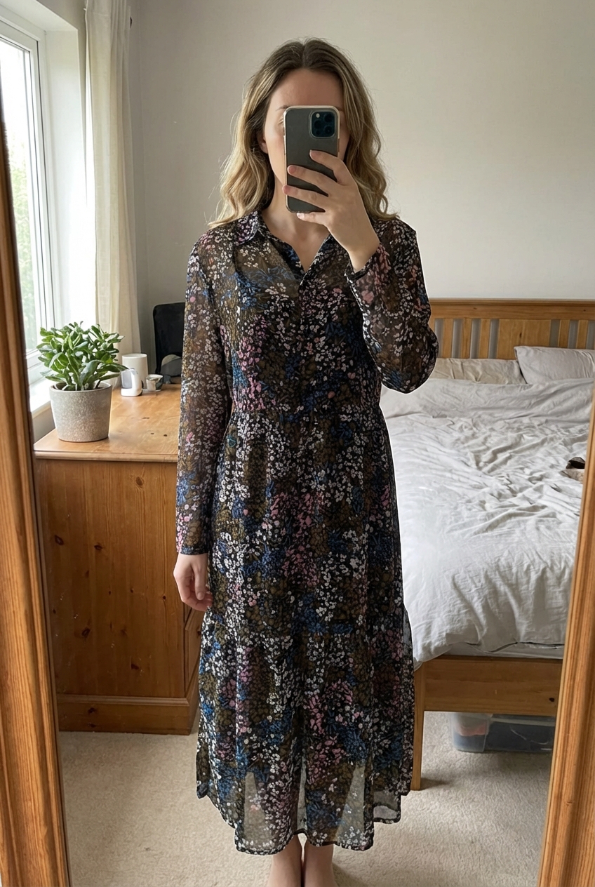 Ichi Floral Long Sleeved Sheer 2 Layer dress size 38 Uk 12 standing straight facing the camera, in a softly lit bedroom setting, with gentle natural light filtering through a window.