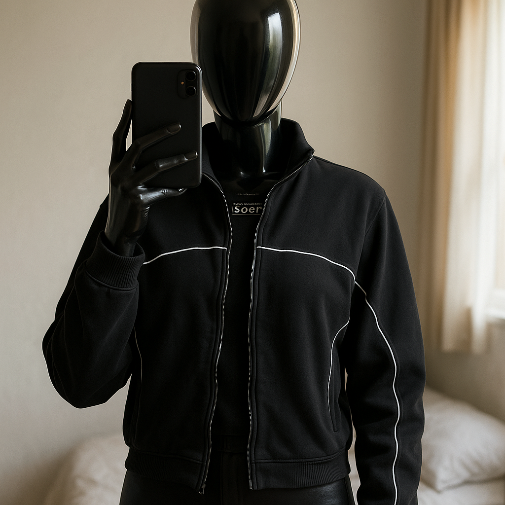 a glossy black plastic mannequin with no facial features in Čierna mikina s reflexnými detailmi standing straight facing the camera, with a slim body type, in a softly lit bedroom setting, with gentle natural light filtering through a window.