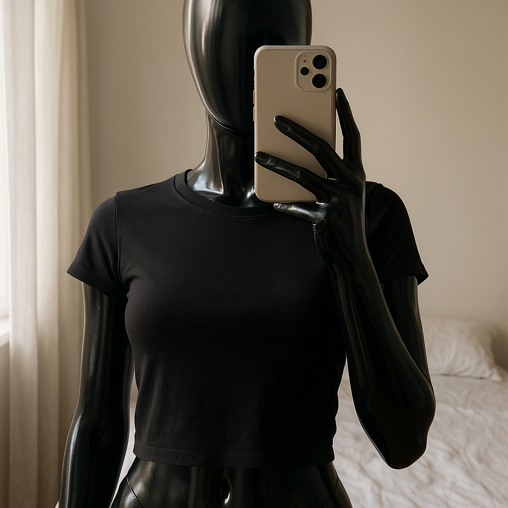 a glossy black plastic mannequin with no facial features in Čierny crop top Zara standing straight facing the camera, with a slim body type, in a softly lit bedroom setting, with gentle natural light filtering through a window.