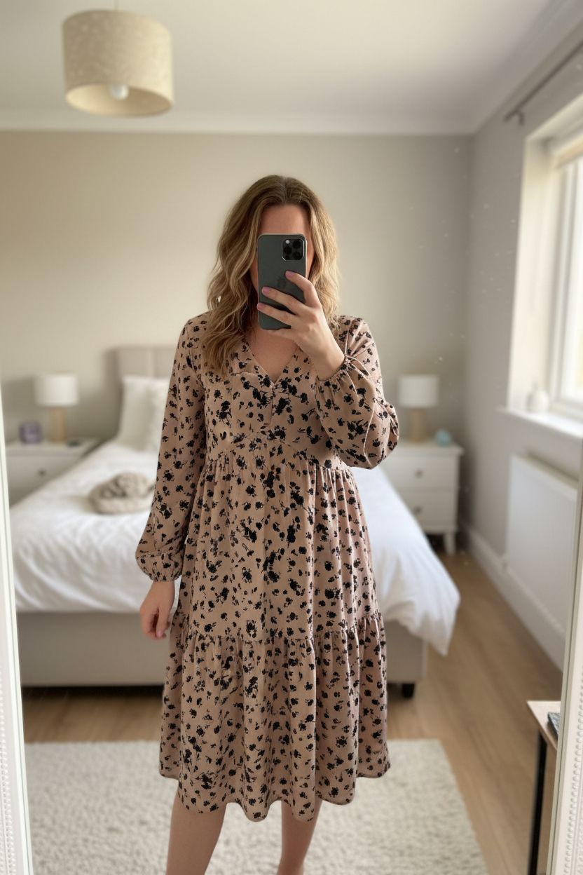 In The Style dress standing straight facing the camera, in a softly lit bedroom setting, with gentle natural light filtering through a window.