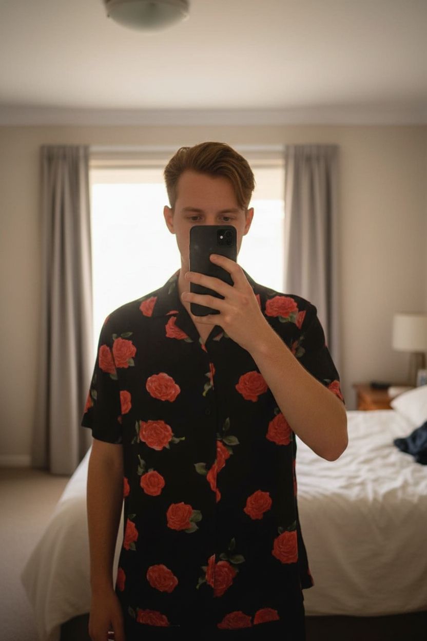 Jack London rose print shirt black floral short sleeve button up XL standing straight facing the camera, in a softly lit bedroom setting, with gentle natural light filtering through a window.
