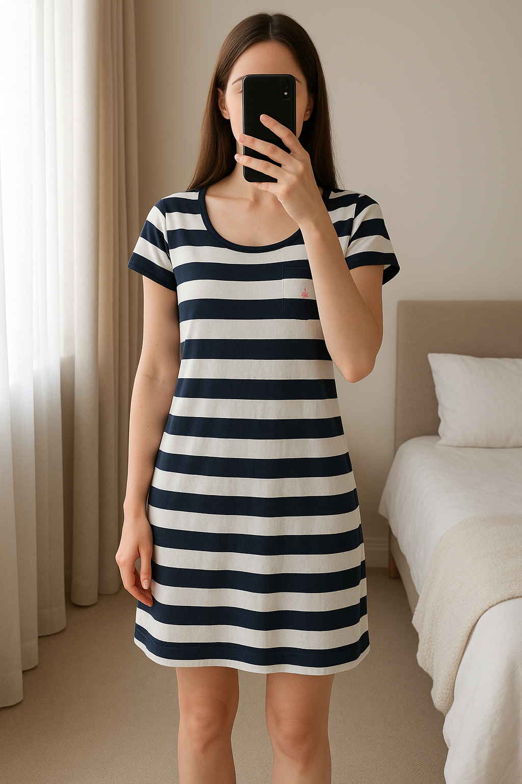 Jack Wills Dress UK Size 8 standing straight facing the camera, in a softly lit bedroom setting, with gentle natural light filtering through a window.
