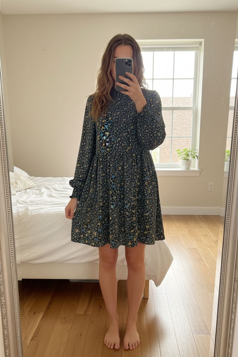 Jacqueline de Yong Floral Mini Dress UK10 Boho Cottagecore standing straight facing the camera, in a softly lit bedroom setting, with gentle natural light filtering through a window.