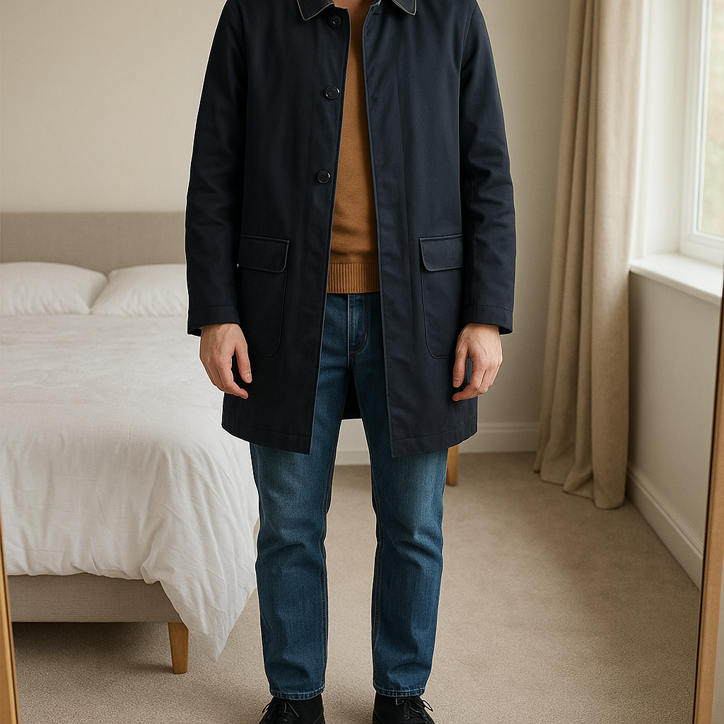 Jasper Conran Men's Navy Quilt Lined Mac Trench Coat - Medium standing straight facing the camera, in a softly lit bedroom setting, with gentle natural light filtering through a window.