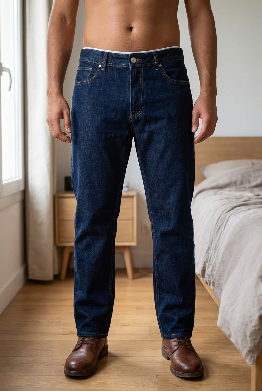 Une personne en Jean 👖 debout, face à la caméra, dans une chambre à la lumière douce, avec une lumière naturelle filtrant par la fenêtre.