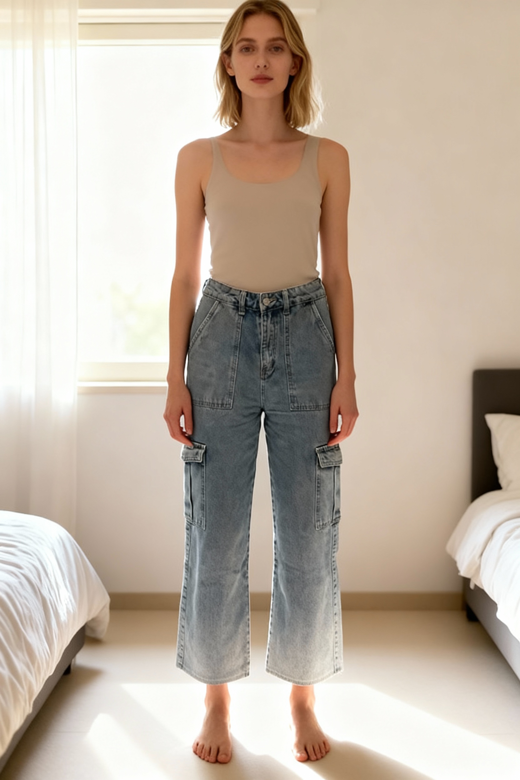 Jean cargo shein debout, face à la caméra, dans une chambre à la lumière douce, avec une lumière naturelle filtrant par la fenêtre.
