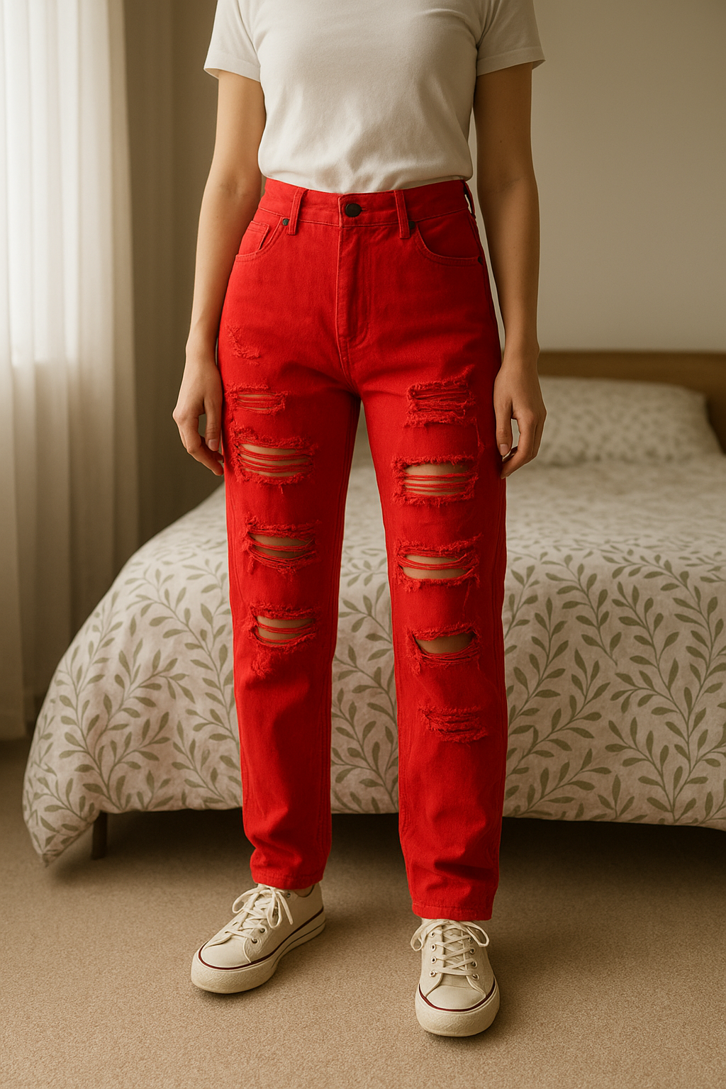 Jean flair rouge debout, face à la caméra, dans une chambre à la lumière douce, avec une lumière naturelle filtrant par la fenêtre.