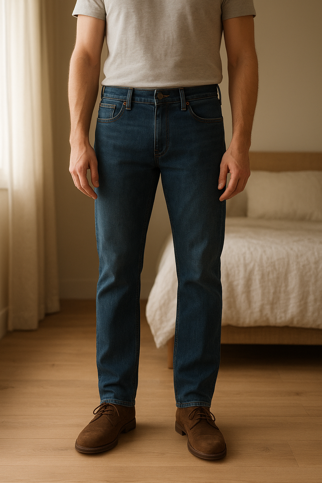 Jean jack & jones debout, face à la caméra, dans une chambre à la lumière douce, avec une lumière naturelle filtrant par la fenêtre.