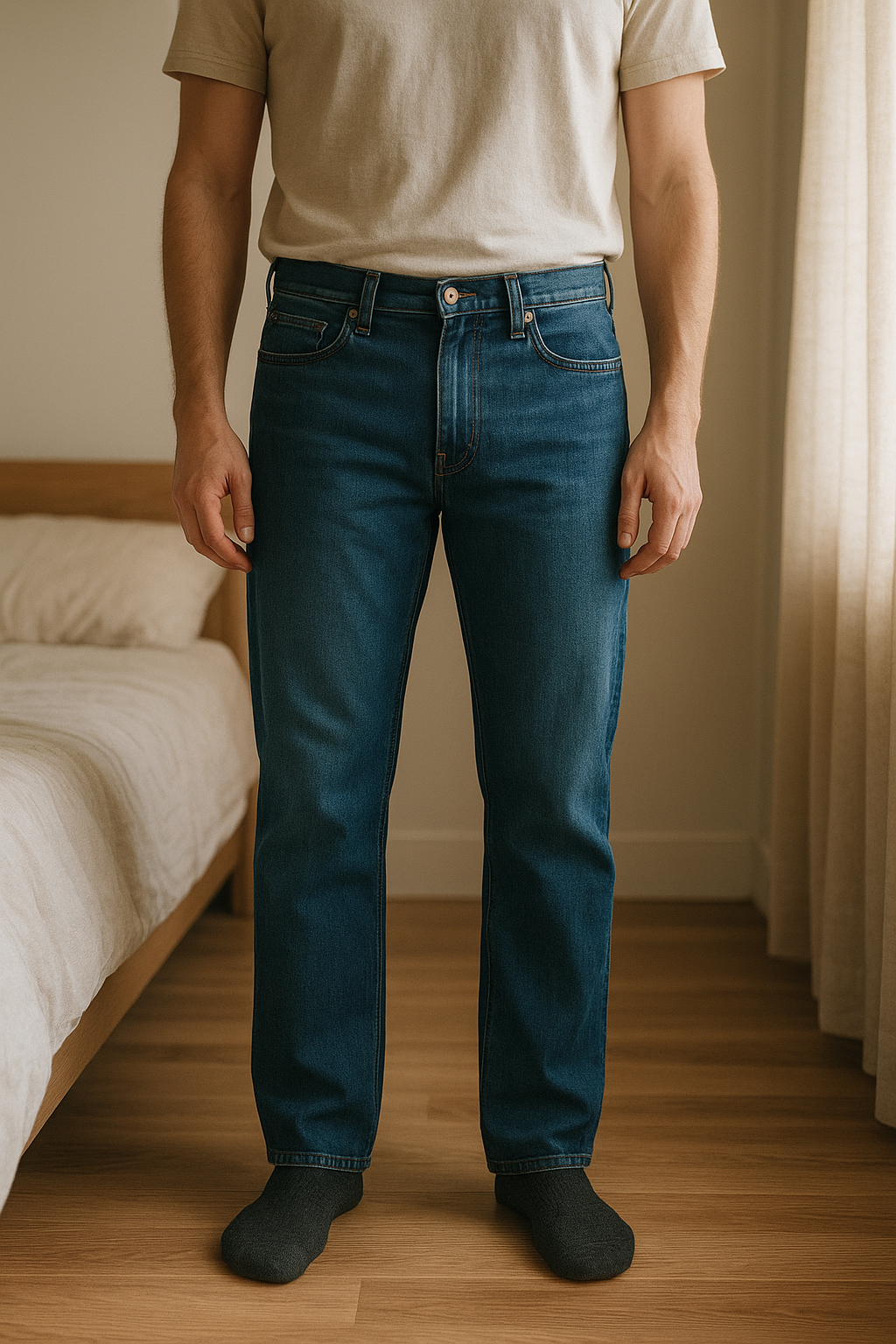 Jean Levis Bleu W36 L32 514 debout, face à la caméra, dans une chambre à la lumière douce, avec une lumière naturelle filtrant par la fenêtre.