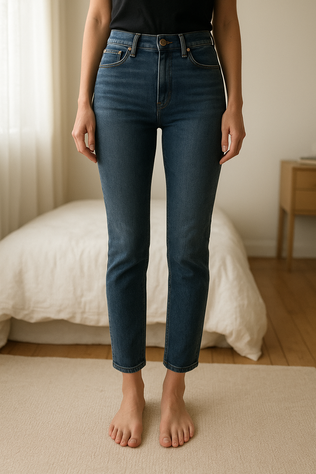 Jean Mom Bershka debout, face à la caméra, dans une chambre à la lumière douce, avec une lumière naturelle filtrant par la fenêtre.