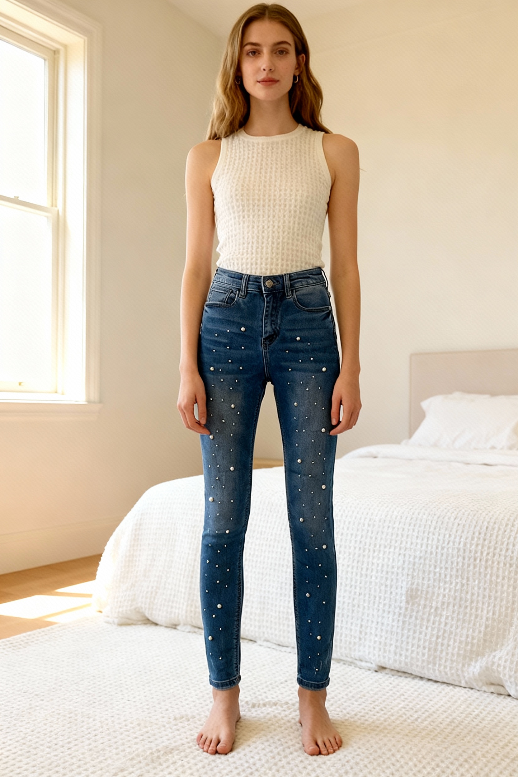 Jean perlé debout, face à la caméra, dans une chambre à la lumière douce, avec une lumière naturelle filtrant par la fenêtre.