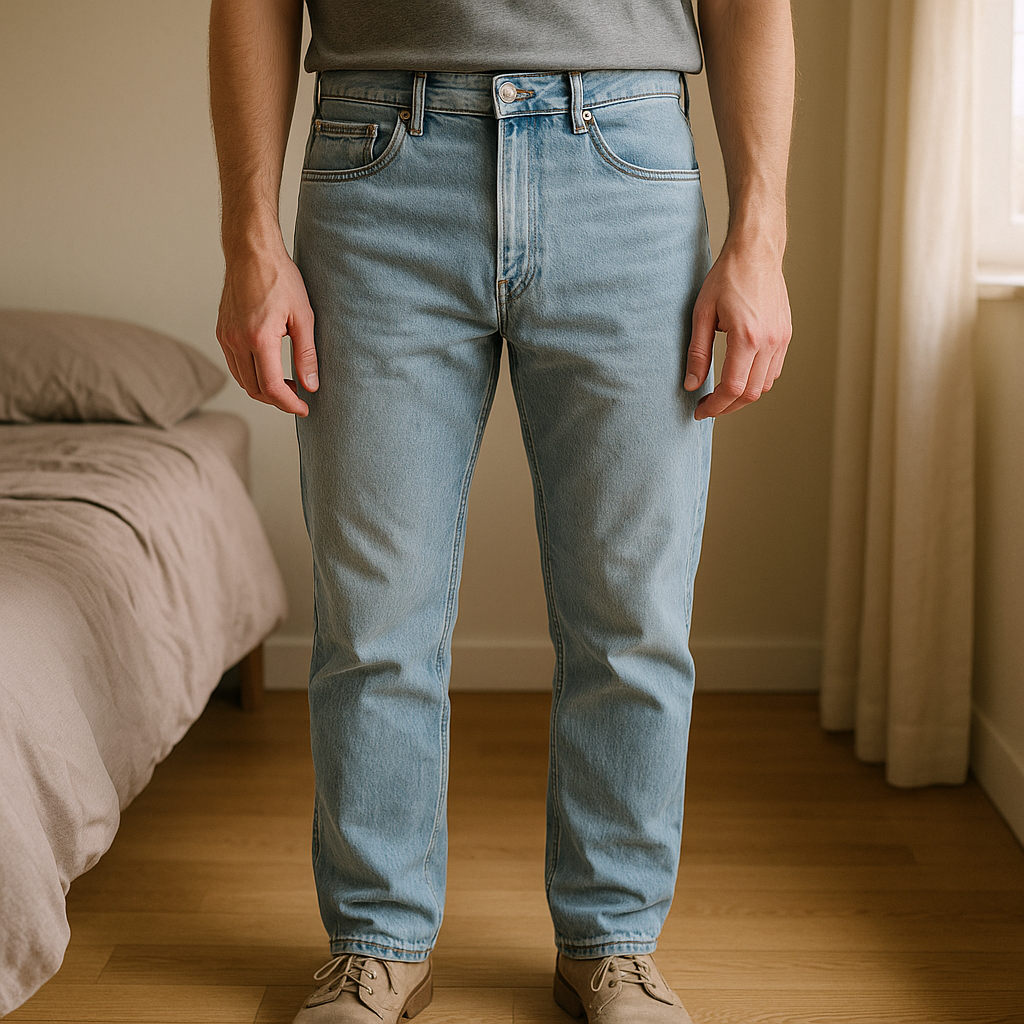Jean Pull and Bear debout, face à la caméra, dans une chambre à la lumière douce, avec une lumière naturelle filtrant par la fenêtre.