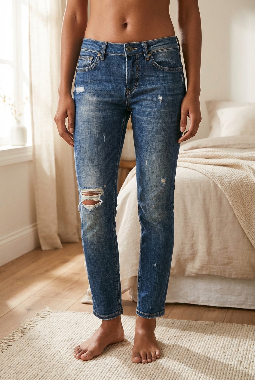 Une personne en Jean Slim Zara destroy Taille 36 debout, face à la caméra, dans une chambre à la lumière douce, avec une lumière naturelle filtrant par la fenêtre.