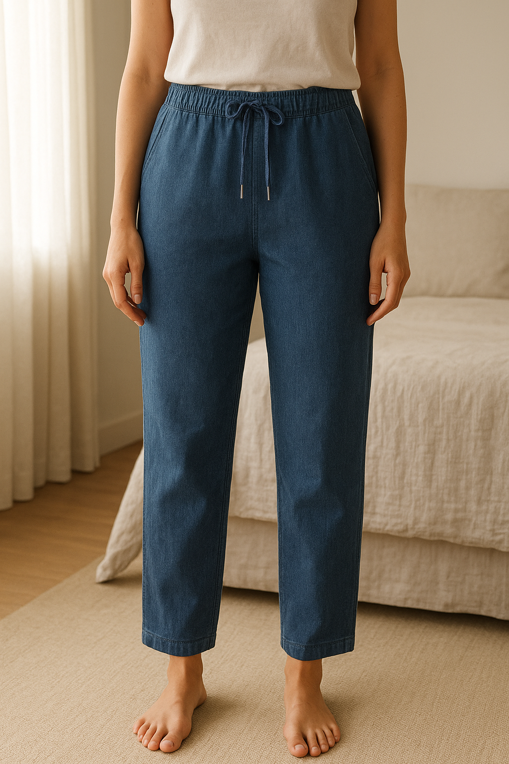 Jean Stretch Coulissant Poches Fendues debout, face à la caméra, dans une chambre à la lumière douce, avec une lumière naturelle filtrant par la fenêtre.