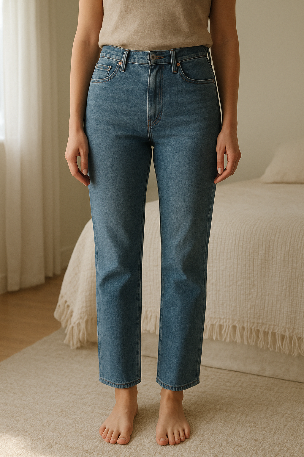Jean taille haute bleu clair debout, face à la caméra, dans une chambre à la lumière douce, avec une lumière naturelle filtrant par la fenêtre.