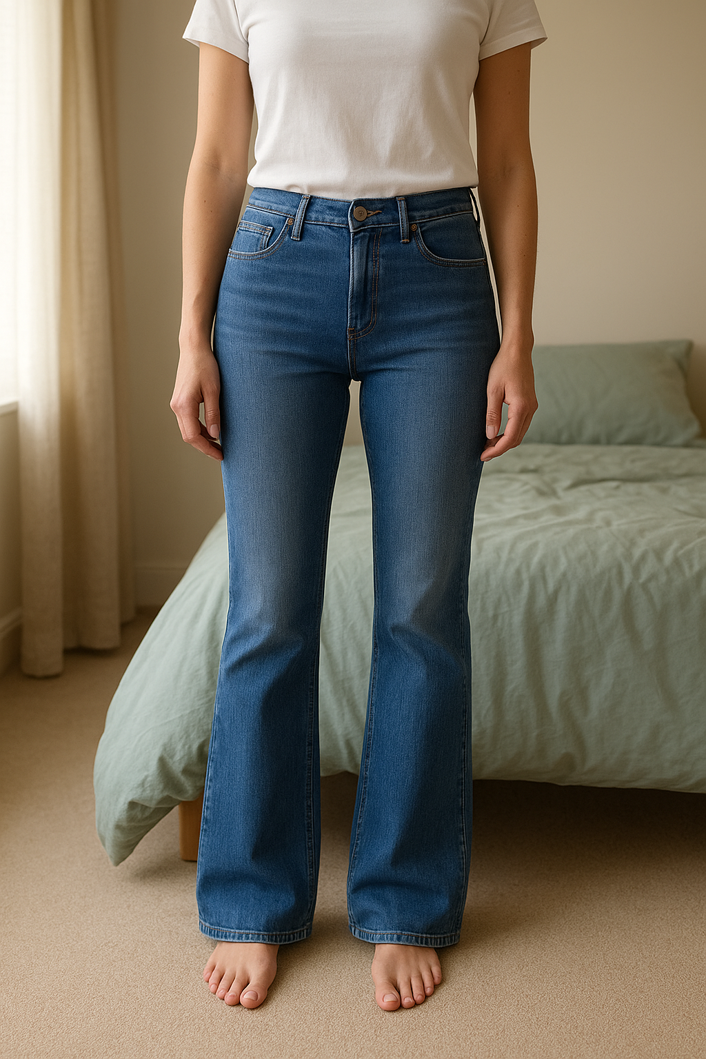 Jeans debout, face à la caméra, dans une chambre à la lumière douce, avec une lumière naturelle filtrant par la fenêtre.