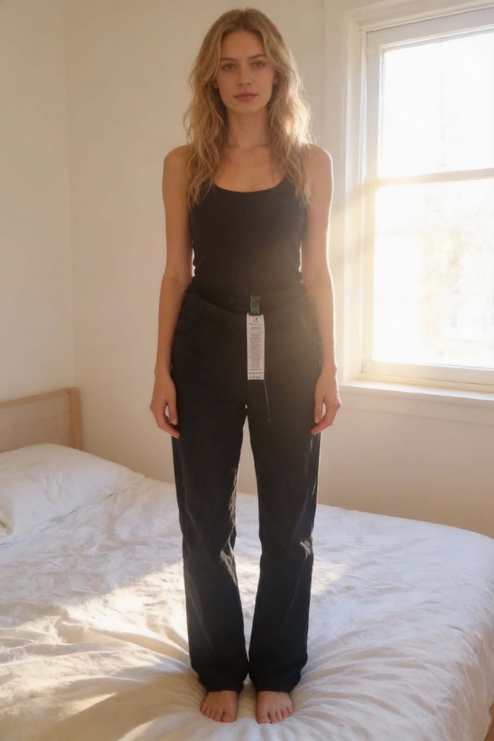 Jeans 54/56 debout, face à la caméra, dans une chambre à la lumière douce, avec une lumière naturelle filtrant par la fenêtre.