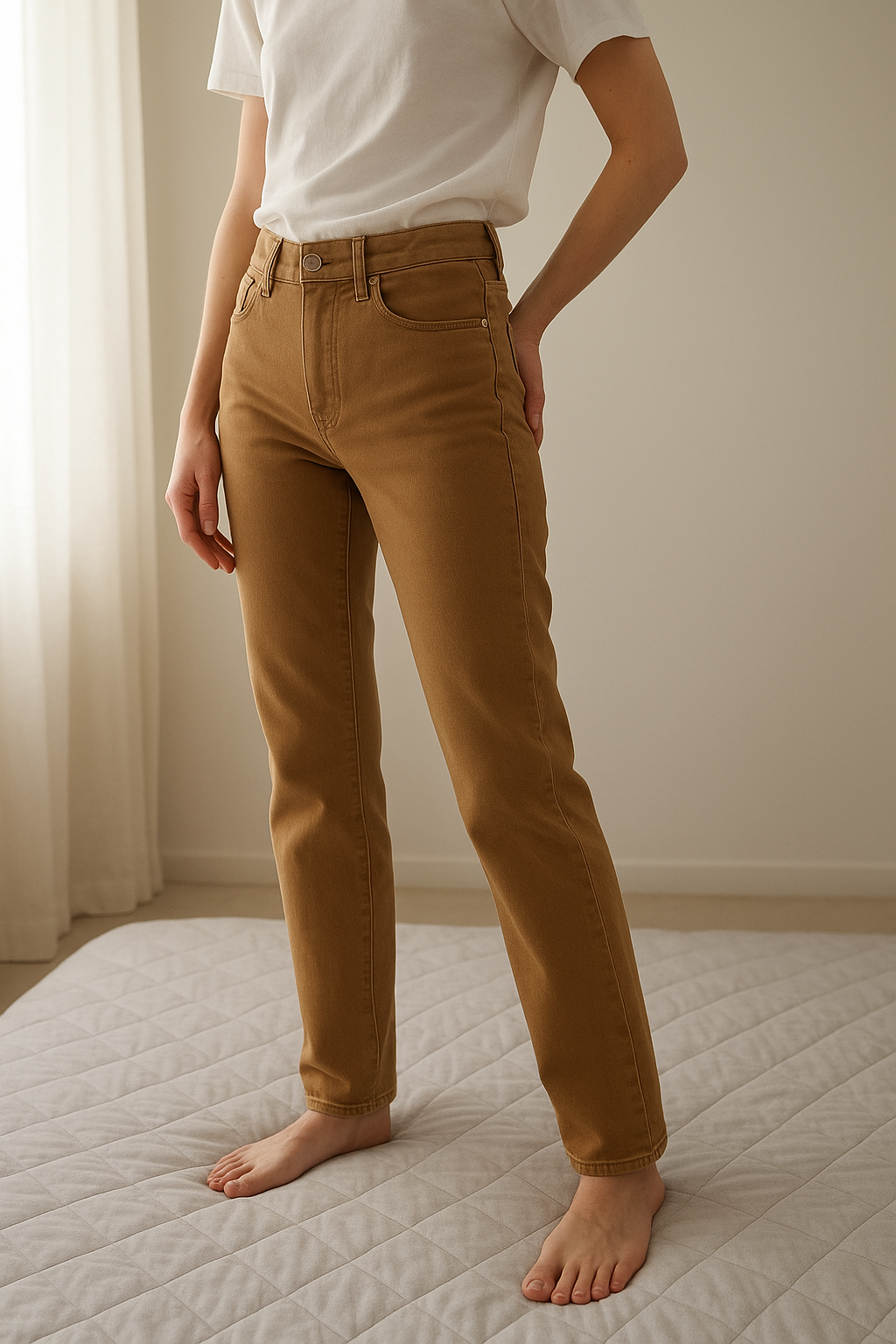 Une personne en Jeans Armani 27 cambrant légèrement le dos pour une pose dynamique, dans une chambre à la lumière douce, avec une lumière naturelle filtrant par la fenêtre.