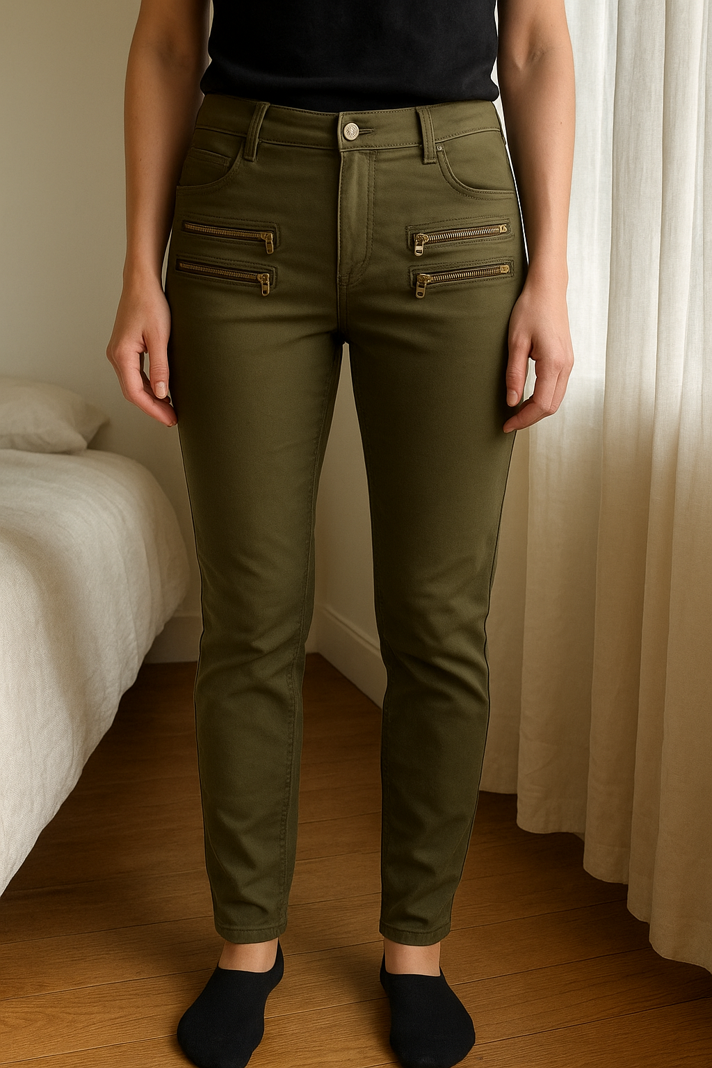 Jeans enduit Morgan T 44 neuf debout, face à la caméra, dans une chambre à la lumière douce, avec une lumière naturelle filtrant par la fenêtre.