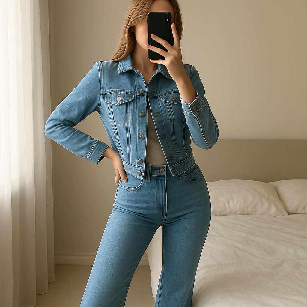 Una persona in Jeans jambes évasées 38 - jeans svasati inarcando leggermente la schiena per una posa dinamica, in una camera da letto con luce soffusa e luce naturale che filtra dalla finestra.