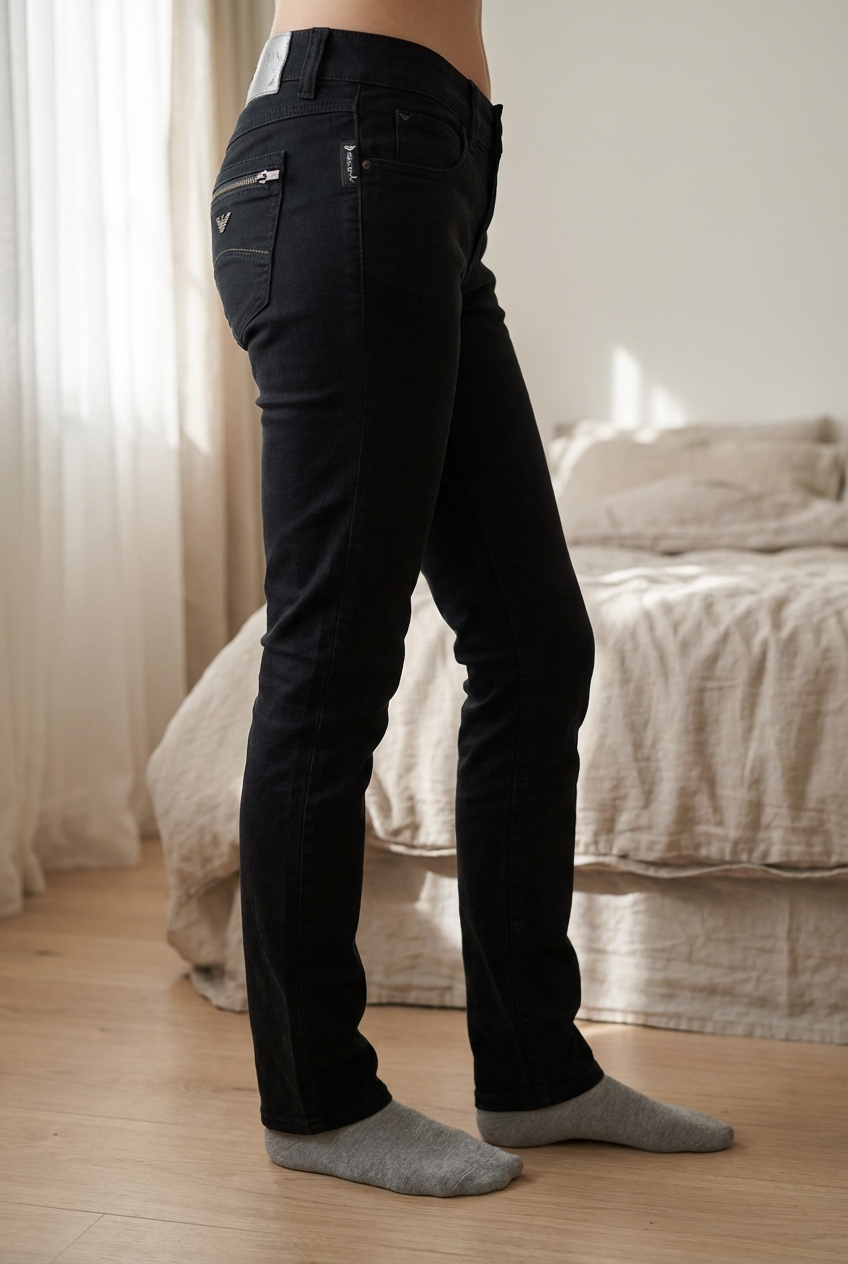 Jeans neri Armani Jeans donna slim fit –zip posteriori –taglia 25 EU in piedi, rivolto verso la fotocamera, in una camera da letto con luce soffusa e luce naturale che filtra dalla finestra.
