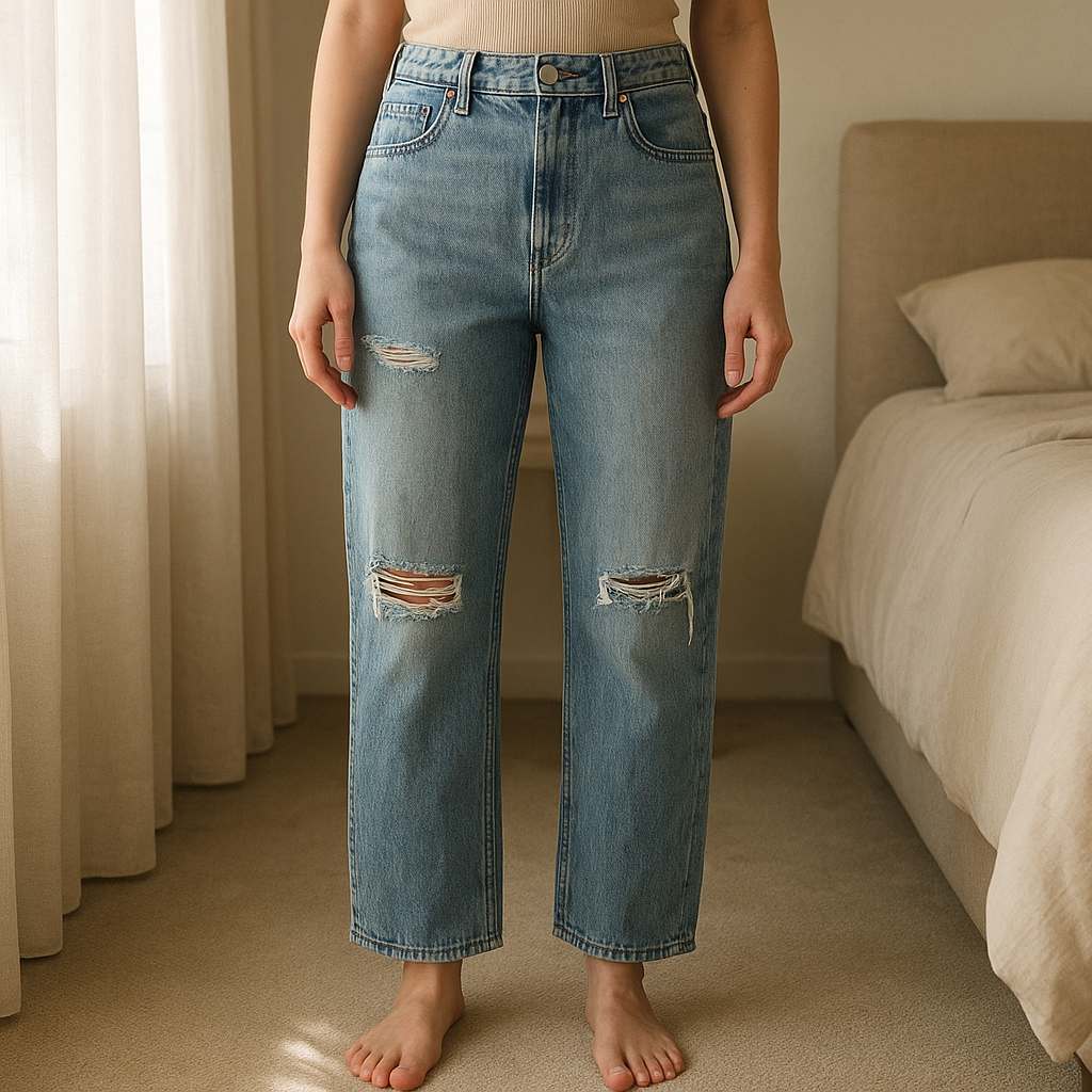 Jeans trouée bleu debout, face à la caméra, dans une chambre à la lumière douce, avec une lumière naturelle filtrant par la fenêtre.
